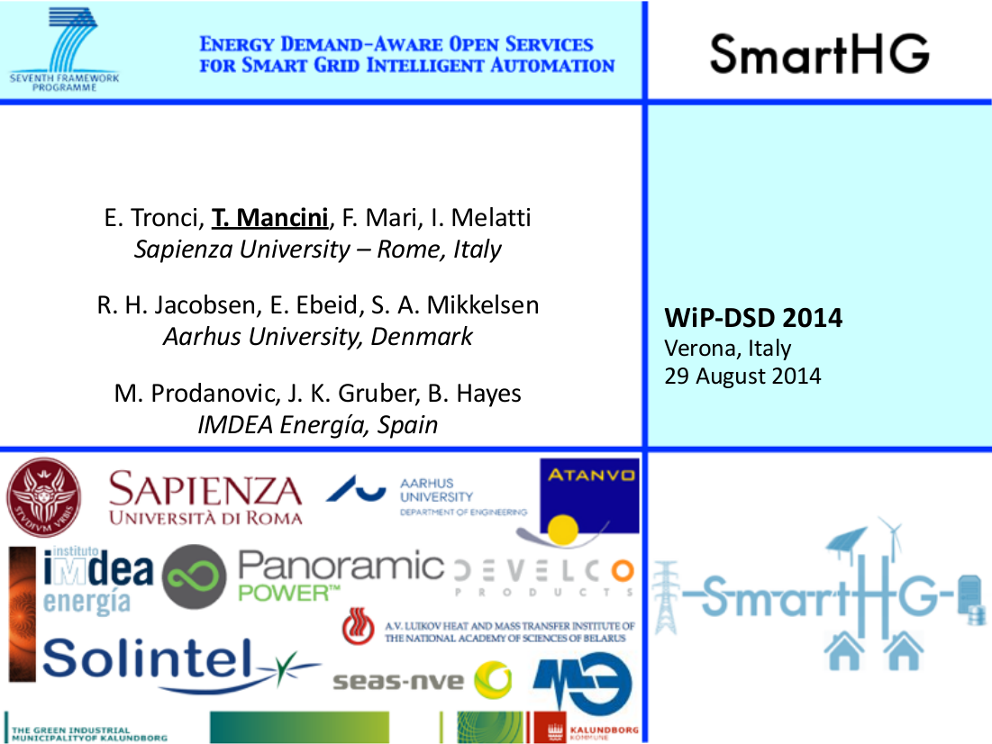 November 2014: The paper “Demand-Aware Price Policy Synthesis and Verification Services for Smart Grids” of E. Tronci, T. Mancini, F. Mari, I. Melatti, S. Salvo, M. Prodanovic, J. K. Gruber, B. Hayes, and L. Elmegaard has been presented at the 5th IEEE International Conference on Smart Grid Communications (SmartGridComm 2014) in Venice, Italy.